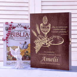 Biblia w drewnianym pudełku - Pamiatka Pierwszej Komunii Św - Kielich