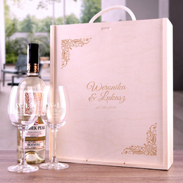 Zestaw pudełko z kieliszkami i miejscem na wino z okazji ślubu