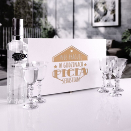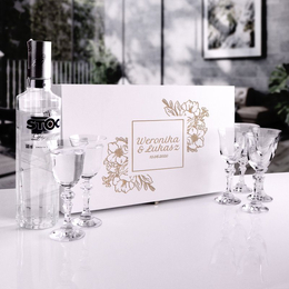 Zestaw sześciu kieliszków do wódki w pudełku drewnianym dla pary
