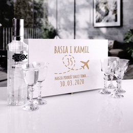 Zestaw sześciu kieliszków do wódki w pudełku drewnianym z okazji rocznicy